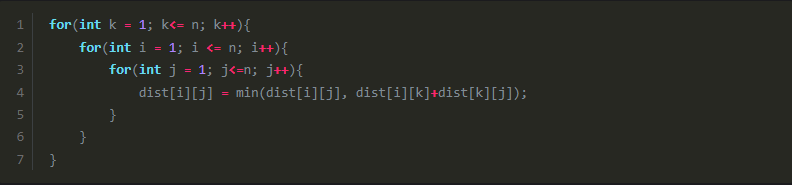 이후, 각 라운드별로 중간 노드가 될 노드 번호를 for문 가장 바깥의 k로 삼습니다. 내부 이중 for문에는 i, j를 통해 각 노드별 모든 거리를 살펴보면서 k를 중간 노드로 삼을 때와 아닐 때의 값을 비교해 더 작은 값으로 업데이트합니다.
