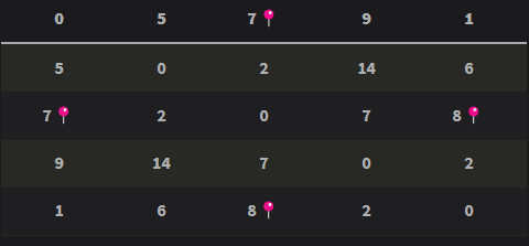 이런 과정으로 5번 노드를 중간 노드로 선정하는 라운드까지 모두 거치면 행렬에는 모든 노드 간 최단 거리가 들어가게 됩니다.