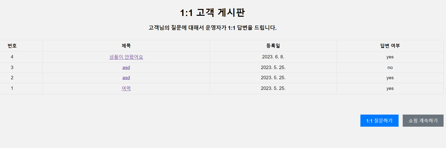- 관리자 페이지로 들어가면 답변여부 확인과 답변을 처리 할 수 있습니다.