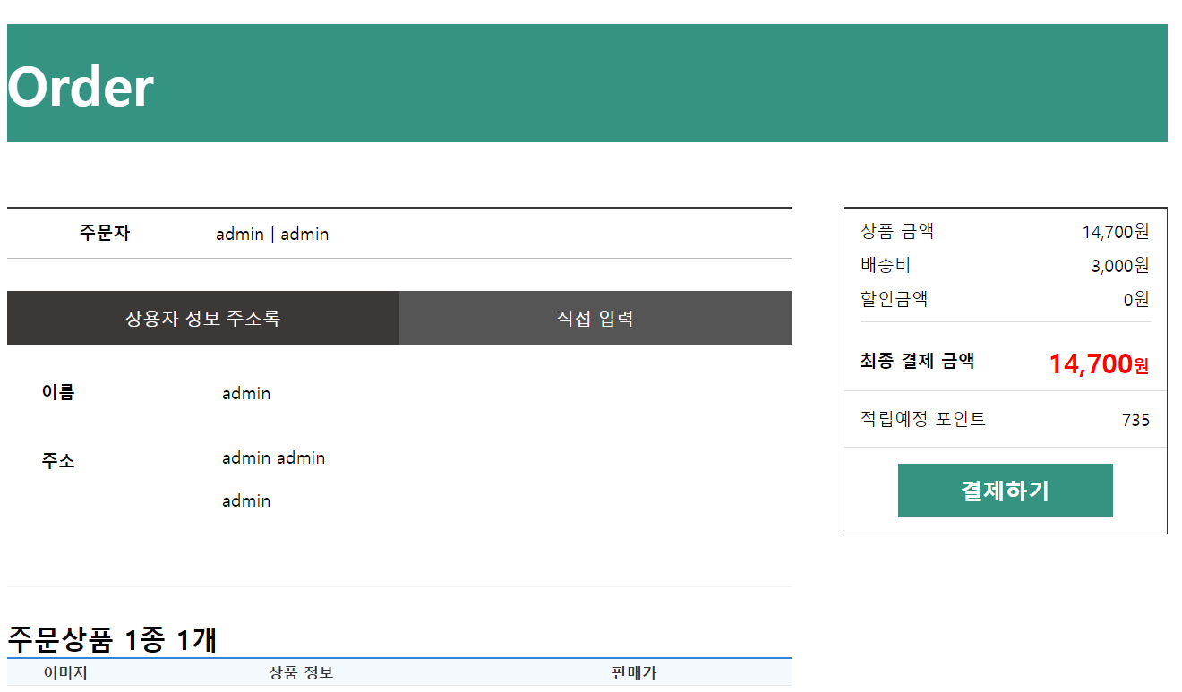 - 주문 페이지입니다. 저장된 주소 정보를 사용할 수 있고, 직접입력 버튼을 누르면 새로운 주소지 등록이 가능합니다.