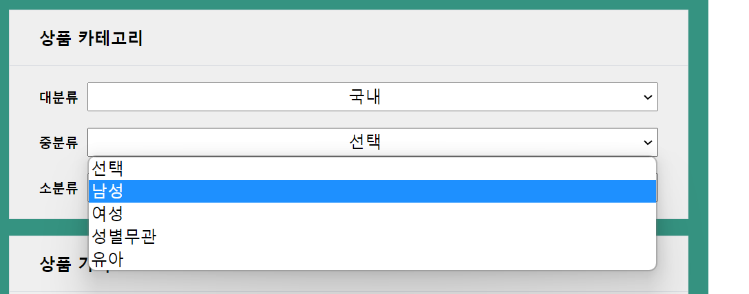 - 상품 등록 페이지 입니다. 회사를 선택할 수 있고, 상품 카테고리를 적용하여 더욱 쉽게 상품을 등록할 수 있게 구현하였습니다.